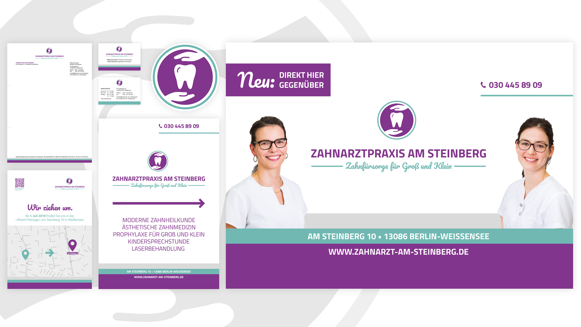 Seit dem Praxisumzug und der Neueröffnung hat sich die Zahnarztpraxis am Steinberg äußerst erfolgreich etabliert. Wir unterstützen die Praxis weiterhin bei verschiedensten Anliegen im Bereich des Praxismarketing. Mit den Basismodulen Corporate Design und Praxiswebsite konnte sich die Zahnarztpraxis am neuen Standort direkt wirksam und nachhaltig positionieren. Alle weiteren einmaligen oder regulären Maßnahmen können damit auch zukünftig ohne viel Aufwand direkt daran anschließen.