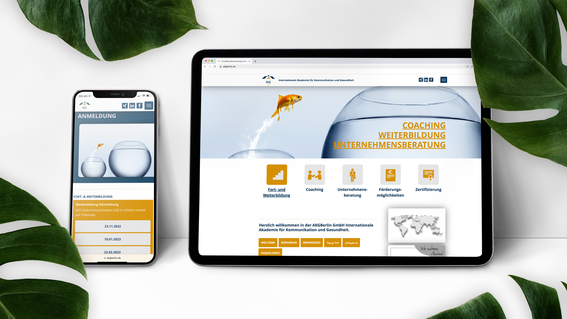 Neben der Entwicklung des Keyvisuals, das auch in anderen Kommunikationsmitteln neben der Website Verwendung findet, war uns die weitere Kundenbindung wichtig, um die Website technisch dauerhaft aktuell zu halten. Durch die Verwendung des Contentmanagementsystem kann der Kunde inhaltlich alle Änderungen selbst einpflegen und auch neue Unterseiten erstellen. Den Erfolg der AKG Berlin GmbH und ihrer Unternehmens-Website sehen wir in zunehmendem Bekanntheitsgrad in der Branche und den ständig steigenden Zahl an Kursteilnehmer:innen – macht weiter so!