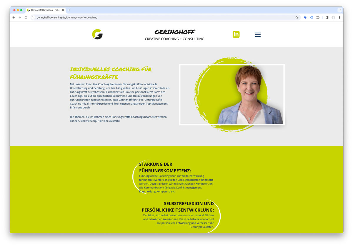 Über einen gemeinsamen Kontakt kam Jutta Geringhoff auf uns zu, damit wir ihren Start als selbstständige Unternehmerin mit einem professionellen Außenauftritt unterstützen. Corporate Design samt Logo sowie ihre Unternehmenswebsite galt es zu realisieren. Das alles in einem Zeitraum von drei Monaten. Sportlich. Aber wie es so ist, wenn man mit Profis arbeitet, ging dieses Projekt trotz straffen Zeitplans fantastisch voran.